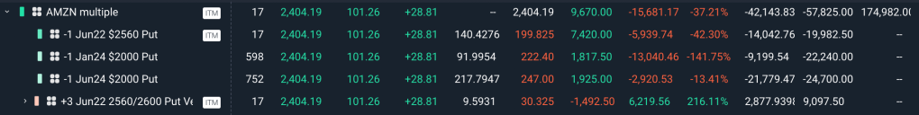 The reason I did this is that theres only 1600$ more to gain from here with AMZN above $2340, but 17 days left on the position, so I would rather take a quick 100% gain off the table than wait it out for a potential 1600$ more. If AMZN stays here or goes higher, I stand to make plenty more on my other AMZN positions (although hopefully not above $2560 because then my bear put spread will start decaying):