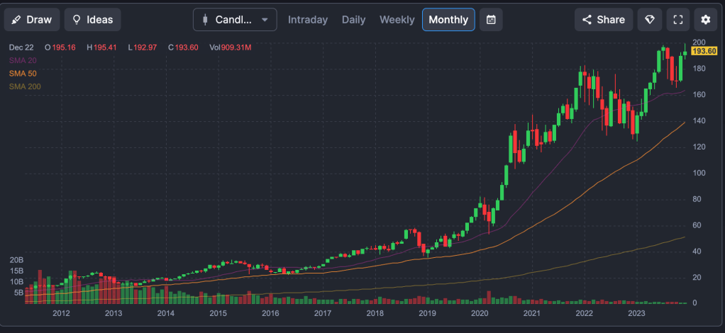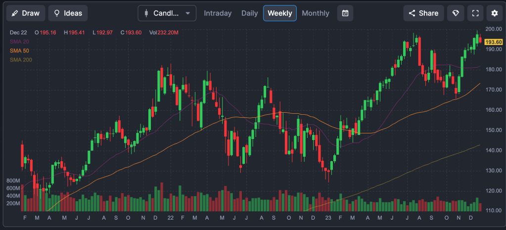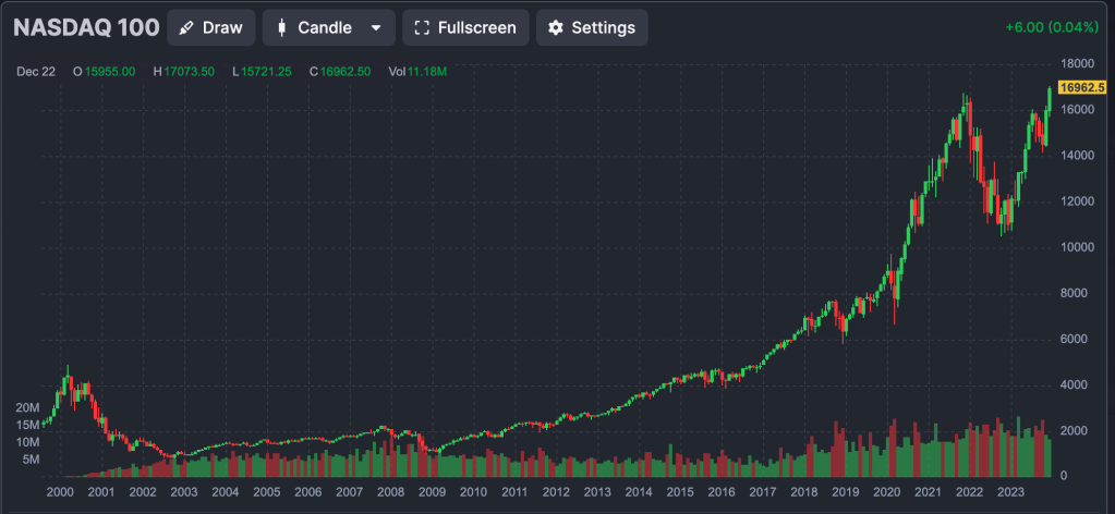 So I guess the moral of the story, and I’m writing this to remind myself as well – although it may seem like it, the end of the world only comes once – at the end of the world. And we haven’t gotten there, at least not yet. And as pessimistic as I am about the world in its current state, with the violence, and pollution, global warming, Trump, Putin, China, Iran, hate, its such a statistically improbably event that when it finally comes, the balance in your bank account will be the least of your worries. And at the end of the worst year for the nasdaq in 50 years (that was 2022), its unlikely that a similar year will follow. And boy has it been a year – a 50% year on the nasdaq! So here we are in a similar (but opposite) situation – at the end of the best year for the nasdaq in 50 years (was it? I didn’t see anything about that but I do assume >50% years are extremely (!) rare), another 50% year is, again, highly unlikely. Which makes holding investments going forward super (!) scary, even though I know (in my mind) that statistically time IN the market is more important than TIMING the market. But honestly, its more important for me to miss a -30% year than to miss another +50% year, and thats why although my portfolio is underperforming the nasdaq, I’m much happier underperforming a 50% year and outperforming a -30% year than the opposite. And if over the rollercoaster that was 2022-23 where the nasdaq went down and up 30% and my portfolio made 16%, hopefully I can continue that over the next 2 years.