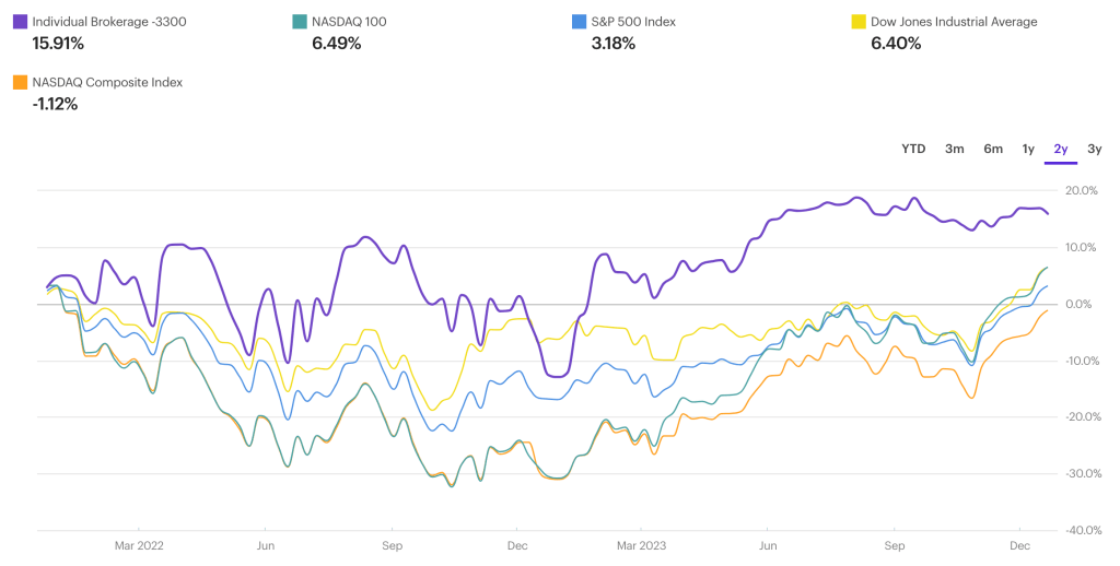 Nonetheless, what happened in 2022 (especially in the end) was BRUTAL to me and my portfolio, and although overall now over the last 2 years, my porfolio is up 16% to the nasdaq 100s 6.5%: